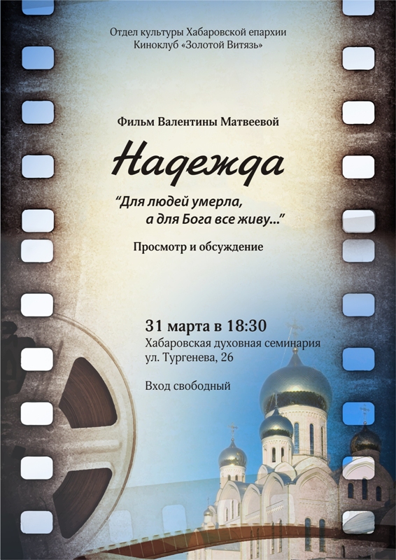 31 марта в 18:30 в Хабаровской духовной семинарии, в рамках киноклуба "Золотой Витязь", состоится показ документального фильма «Надежда» режиссера Валентины Матвеевой, заслуженного деятеля искусств Российской Федерации, автора более 70 документальных лент, среди которых трилогия о митрополите Антонии Сурожском, фильмы о русских монастырях и святынях.